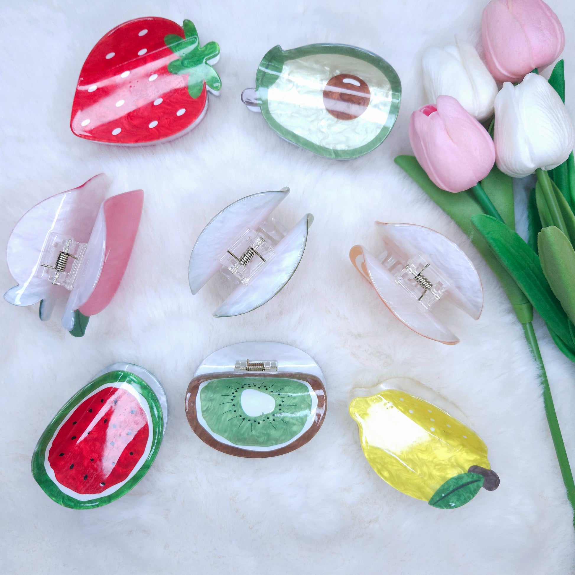Add a touch of fruity flair to your hair with these playful hair claws. Featuring a glossy finish, these claws are perfect for adding a fun and unique touch to any hairstyle. Get ready to turn heads and show off your quirky side with these Fruity Flair Hair Claws!