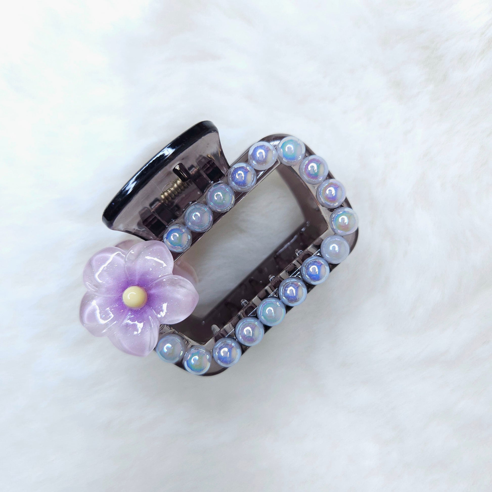 Introducing the Lily Pearls Rectangle Hair Claw – a stunning fusion of delicate lily design and lustrous pearl accents.