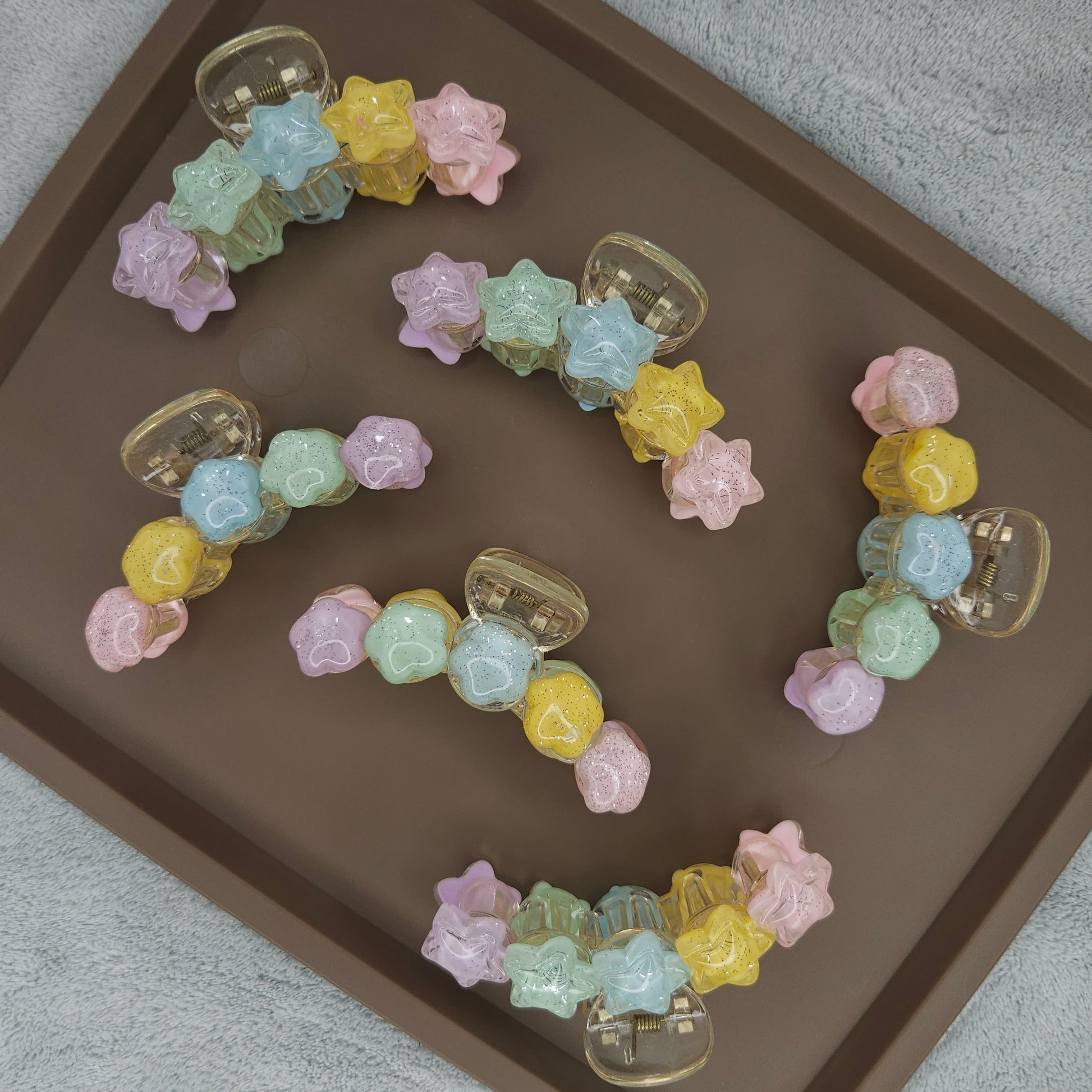 The Pastel Glitter Hair Claw features a unique five-star design adorned with soft pastel colors and shimmering glitter. Engineered for a firm yet gentle grip, it secures hair effortlessly without damage. This accessory combines both aesthetic appeal and practicality, enhancing hairstyles with a touch of elegance suited for everyday use or special events.