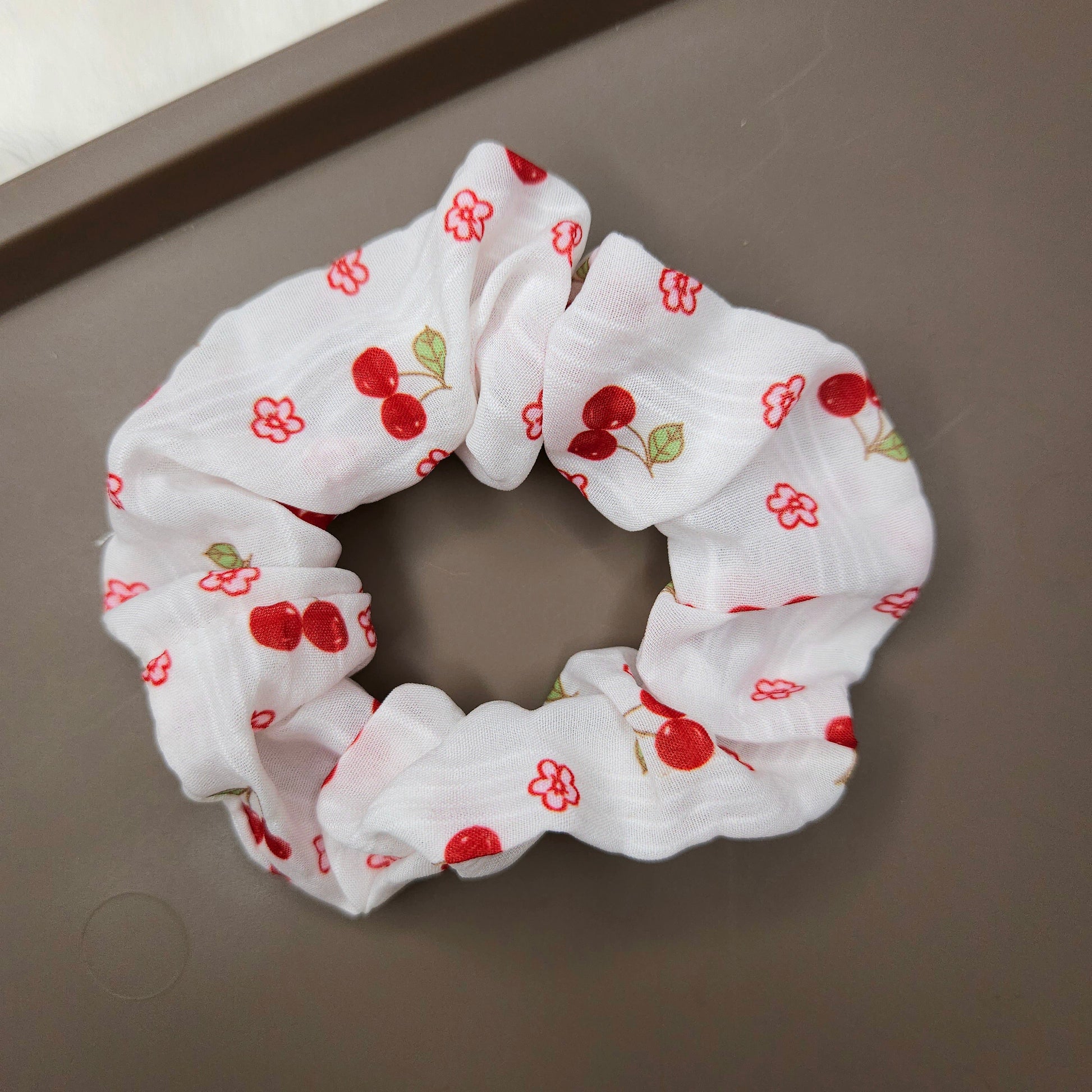 This beautiful scrunchie features a classic white base adorned with vibrant red floral accents, creating a timeless and sophisticated look. Perfect for adding a pop of color to your hairstyle while keeping your hair secure and crease-free.